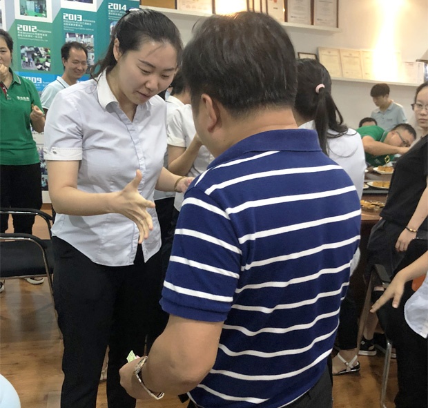 13日下午,我們?cè)跁?huì)議室集合,大家一起做“中秋送月餅”互動(dòng)游戲?;顒?dòng)開始前,每人制作一張祝福卡,寫上中秋祝福語(yǔ)。游戲期間兩兩一組喊出游戲口號(hào),然后手指比劃1-5任意數(shù)字,按照1>5>4>3>2>1的規(guī)則判定輸贏,獲勝者將會(huì)得到對(duì)方的祝???,獲得??ㄗ疃嗟娜藭?huì)獲得神秘大獎(jiǎng)。