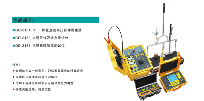 GD-2136系列電纜故障測(cè)試系統(tǒng)集成了測(cè)距、定點(diǎn)以及路徑探測(cè)等功能,能對(duì)電纜的高阻閃絡(luò)故障、高低阻性的接地、短路和電纜的斷線,接觸不良等故障進(jìn)行測(cè)試,適用于測(cè)試各種不同型號(hào)、不同電壓等級(jí)的電力電纜及通信電纜。